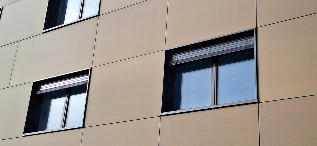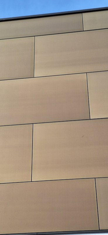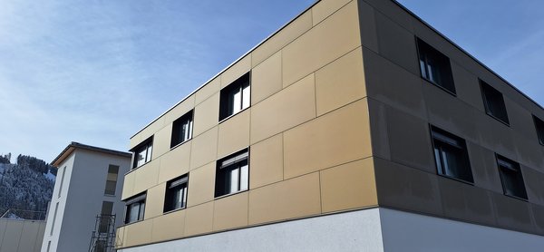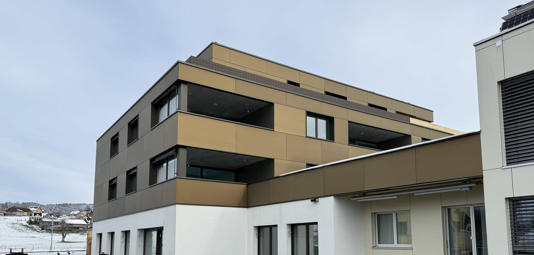 Das Gerüst wurde entfernt, die Fassade erstrahlt bei Sonnenschein goldig und produziert allseitig Strom!
